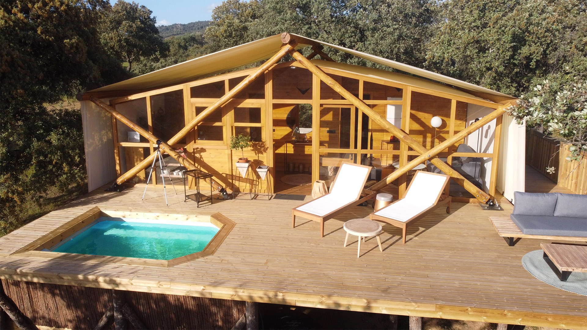 Amenities for hoomans: Suites and luxurious tubbos with private pools, Glamping experience, Stargazing, Sierra Morena's untamed beauty.